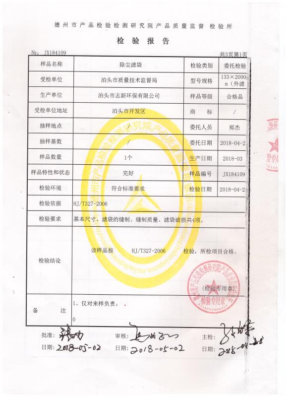 除塵布袋檢驗(yàn)報(bào)告