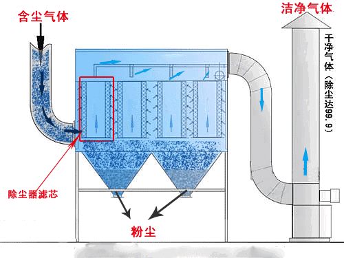 袋式除塵器除塵原理是含塵煙氣通過(guò)過(guò)濾材料,塵粒被過(guò)濾下來(lái),過(guò)濾材料捕集粗粒粉塵主要靠慣性碰撞作用,捕集細(xì)粒粉塵主要靠擴(kuò)散和篩分作用。濾料的粉塵層也有一定的過(guò)濾作用。含塵煙氣經(jīng)煙道進(jìn)入進(jìn)氣管,由上部進(jìn)入進(jìn)氣室,部分粗粒由慣性而落入灰斗,其余部分煙氣粉塵進(jìn)入除塵布袋,經(jīng)內(nèi)表面過(guò)濾后,進(jìn)入袋室,然后經(jīng)由通風(fēng)槽、排氣閥、出氣管道由排。