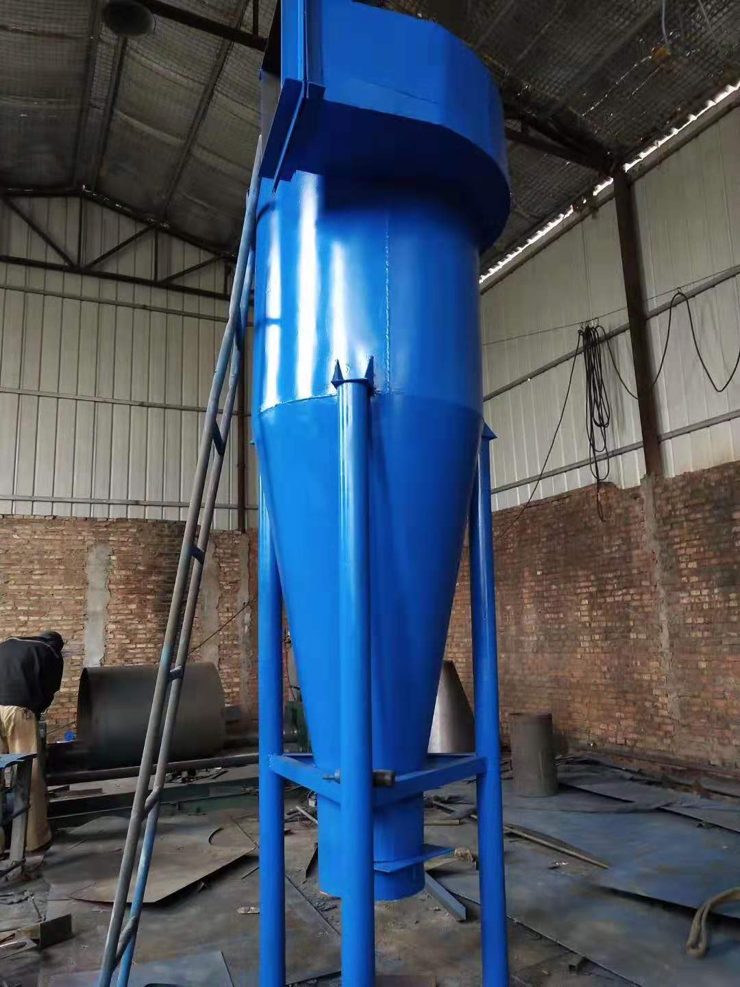 旋風(fēng)除塵設(shè)備(Cyclone dust collector)是使含塵氣體產(chǎn)生高速旋轉(zhuǎn)運(yùn)動(dòng),通過(guò)對(duì)塵粒施加離心力而使粒子從氣流中分離出來(lái)的除塵設(shè)備(Dust collector)。含塵氣體由裝在筒側(cè)且與之相切的進(jìn)氣管切向進(jìn)入筒體內(nèi),沿筒內(nèi)壁旋轉(zhuǎn)。在同一平面上轉(zhuǎn)360°后,被后續(xù)進(jìn)入的氣流擠壓而旋轉(zhuǎn)著向下,而后上氣流進(jìn)入排氣管,塵粒在離心力的作用下甩向器壁,并在重力和向下旋轉(zhuǎn)的氣流的作用下落入灰倉(cāng)。以凈化氣流于圓錐底部被迫轉(zhuǎn)向除塵器中心,在中心形成旋轉(zhuǎn)向上的氣流,由排氣管排出。