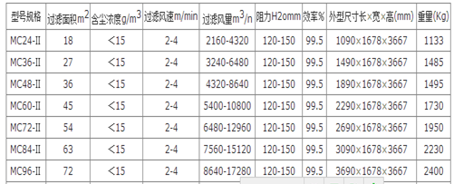 MC型布袋除塵器詳細(xì)參數(shù)表: