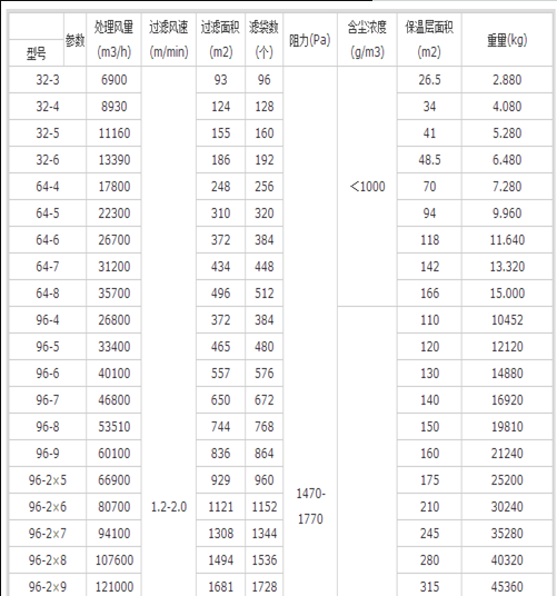 離線氣箱脈沖布袋除塵器型號(hào)表: